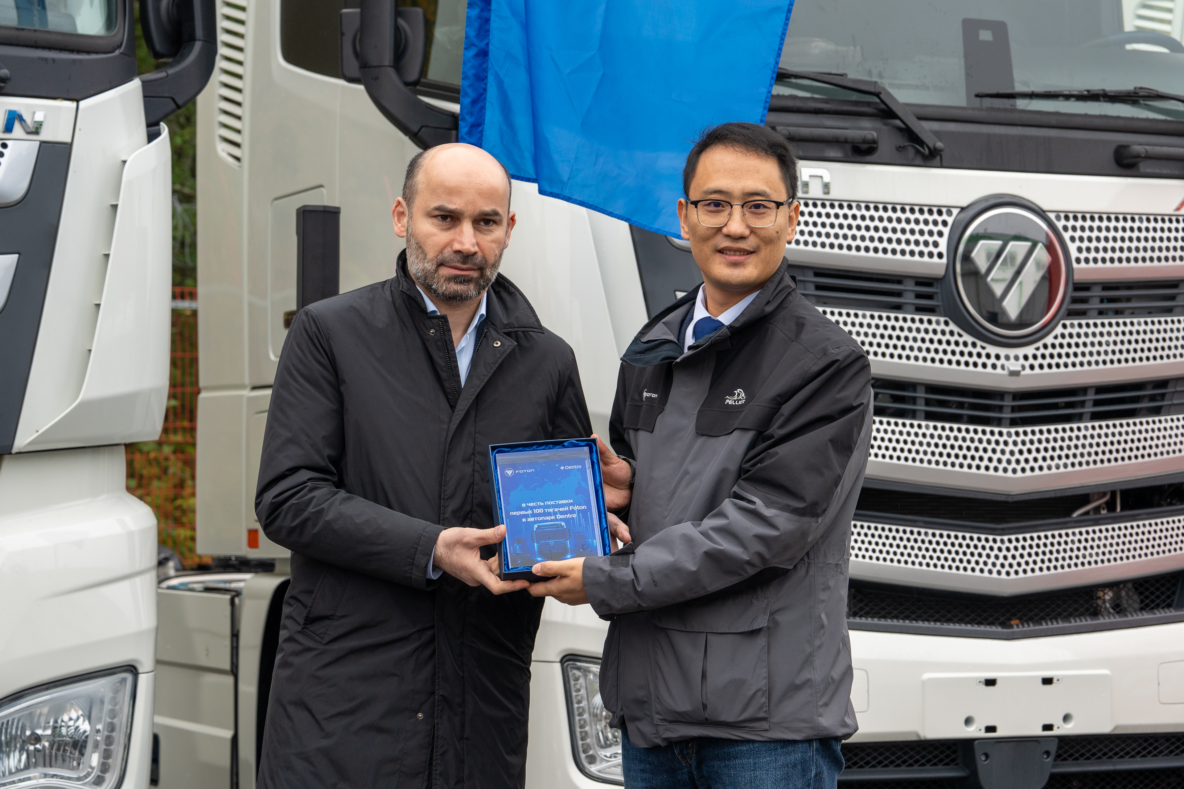 Торжественная церемония ознаменовалась вручением памятной плакетки в честь поставки первых 100 седельных тягачей Foton R для компании Dentro и символического ключа, дающего старт к новым вершинам партнерства наших брендов. Все водители компании Dentro получили фирменные подарки с логотипом Foton, которые будут сопровождать их в дальних рейсах.